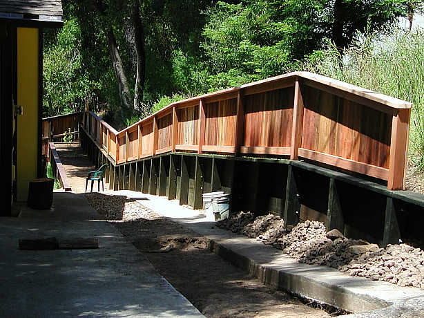 On to the 2nd row of pics (left side). Bouyed by success with the concrete pad, I decided to take on my biggest project to date--removal of the hill sliding into my backyard + a new retaining wall. And, I wanted the new wall to align with the property line (unlike the old one)! Started in the Spring of 2003 (stopping only after the ground became too hard); restarted and completed in the Spring of 2004. Talk about learning and getting exercise. In this fence project, I did everything--the digging, dirt hauling, concrete work and carpentry, aided considerably by a sweet 10" slide compound miter saw + a heavy duty chopping spade for punching through the sandstone...and oh yeah, plus a sturdy yard cart and a big pile of Nitrile gloves. Learned too many things to mention here...