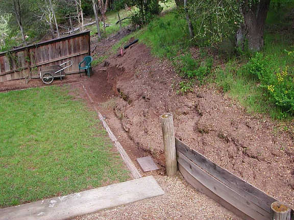 | The early on hill removal portion of my retaining wall / fence project, as seen from the back of the house. | The retaining wall / fence, close to completion (view is from the driveway). | Buried sewer & water runoff drains and spliced wall panel, after the initial excavation work. | Pretty repainted siding, cleanout access hatch and pressure-treated retaining walls. |