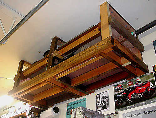 I completed the garage rack project over the Easter ’05 weekend. Who needs more storage space in the garage? Me me me. Too many tools, bike parts and just plain stuff using floor space that could be used for ... another bike! Chris' XLCR in particular. Bolted to the ceiling joists and walls, this is the larger of 2 storage racks built as permanent additions to also withstand earthquakes. All done with used and unused wood, no materials costs!