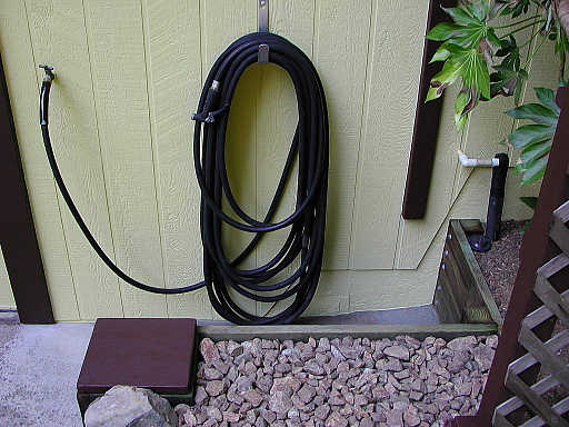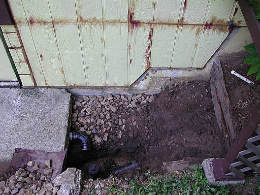 After the labor intensive fence work, I needed to coast some, so I began what became the cleanout project later in the summer of ’03. Originally, all I wanted was to replace the dryrotted siding near the garage. In the 2nd row of pictures (right side), you can see that (surprise!) my excavation uncovered some plumbing (and how I spliced in the new panels). The finished view is close to how it all looks today. Discovery of the sewer line inspired me to build a cleanout access hatch integrated with the retaining walls. Nothing like a drive-up cleanout to minimize plumber labor costs!