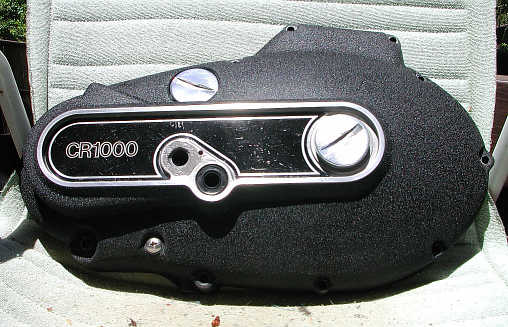 | Tailpiece fiberglass work on my brother’s XLCR. The darker section with the turnsignal mounting hole was missing. | Repainting work on the XLCR’s primary cover. Even squeegied out the wrinkles in the aluminum CR1000 label. | The XLCR restored, ready to run, patiently waiting for a nice sunny day to start it up. | One of the overhead storage racks added to my garage to make room for the XLCR (temporarily of course). |