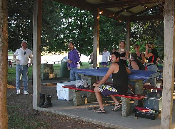Friday, I spent time with brother Chris and family. Washed gravel dust off the bike. Met neighbor Gary, a Honda racebike afficionado. Escaped to the party (food and lodgings) in Woodland, WA around 4pm. Took a few pictures. Canadians finally arrived, adding their brand of fun. Partied hardy. Shoulda gotten a picture of Debi’s new bra for her Triumph’ bug eye headlights! Ok, click on the link below all my photos--someone else got a picture of my handiwork for posterity ;-)