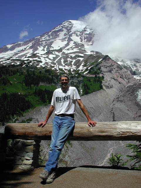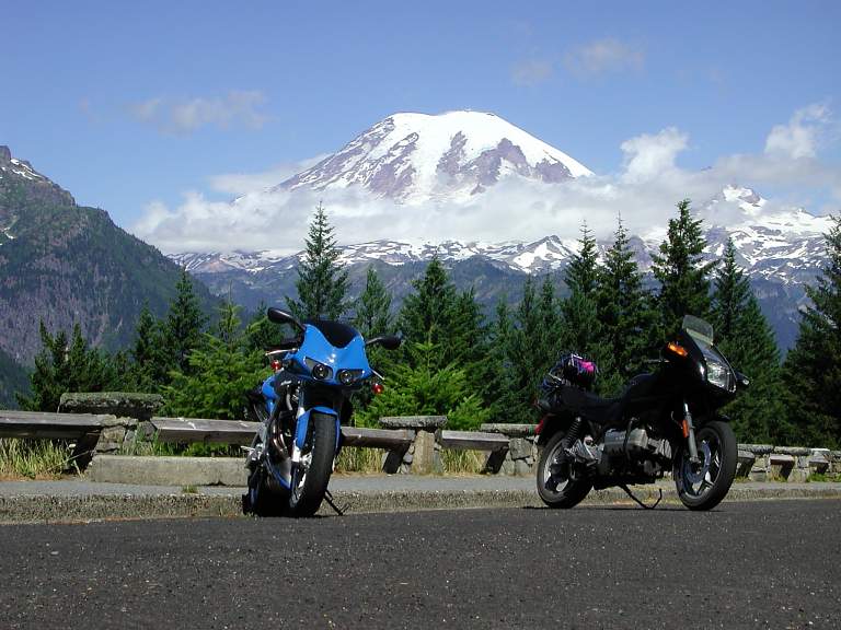 | Sunset from Paul’s deck overlooking the Ophir, OR coast. Treated to fresh oysters, salmon, albacore, live band, fun rides, garaging for our bikes, and soft spots to catch some zzzz's after we’d had enough. Thanx Paul for your gracious hospitality! | XB9R with my touring gear (minus large fanny pack). We had stopped to admire the countryside around Mt. Rainier. | My XB9R and Chris’ K100RS at a scenic overlook. Chatted with an ex-Bueller on an Aprilia, who wanted to know more about the XB. | Chris catching his breath after a small hike before Mt. Rainier. The clouds around the peak parted just in time for this shot. |