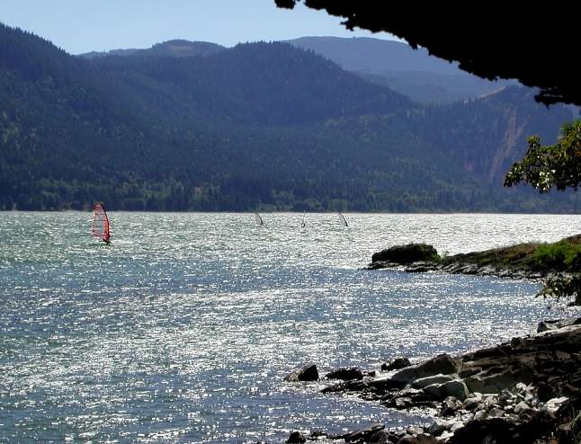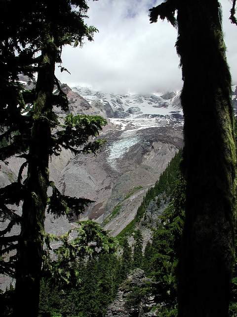 | Windsurfers at Windy Ridge along the Columbia River, OR. Taken just before we got lost on the Super SPLASH route. A bank sign said 104 degrees F (!) in the next valley we rode through. | A receding glacier on the visitor center side of Mt. Rainier. Check out the blue ice. How quickly the clouds moved back in, only minutes after the picture of Chris was taken!!! | ||