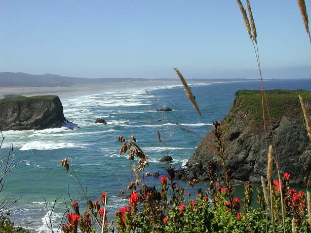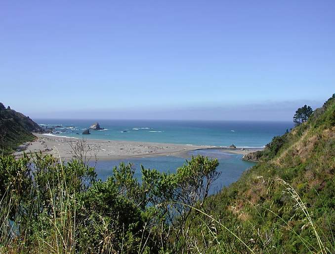 | On the way up to my first night’s stay at Gold Beach, it was an uncommonly sunny day along the CA Hwy 101 coast. I just had to stop and take this picture somewhere north of Eureka, CA. | Another shot of the beautiful coast farther north. A small inlet and secluded beach, south of Gold Beach, OR. | Some of the Buellies at the SPLASH kickoff party in Woodland, WA. I hadn’t seen many of these folks since the 1998 SPLASH--Sharon & Gumby were good to go, Ferris was honored guest, and the girls were trash talkin’ & lookin’ good! | “Different in Every Sense” takes on new meaning! A local (historic military vehicles) owner drove over with this nicely restored halftrack to check out our party. We stuck this Buell sticker on its hood as a welcoming gesture :-) |
